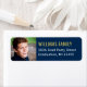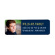 O design de etiqueta de endereço personalizado moderno apresenta uma fotografia de graduação do formando com texto de endereço de retorno em ouro e branco e fundo azul escuro do marinho. Personalize o texto e as cores de fundo para coordenar com as cores da foto ou da escola/universidade!