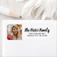 Etiqueta de endereço de retorno de graduação moderna com sua foto favorita do formando junto com seu nome de família em um roteiro grosso e seu endereço em preto sobre branco. Esta simples etiqueta de endereço de retorno é uma forma excelente de fortalecer os envelopes para seus anúncios de graduação.