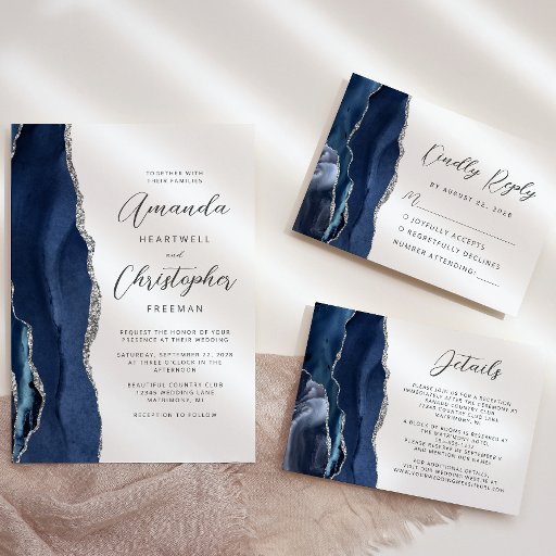 Agate Navy Blue Silver Modern Script Wedding SuiteCriado por Akhates Designs