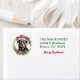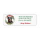 Nesta etiqueta de endereço de retorno de Férias, um majestoso cão Rottweiler é enquadrado dentro de uma coroa de Natal verde com um arco vermelho no topo. Seu texto personalizado fica verde à direita, com um campo de texto para uma saudação em vermelho abaixo.
