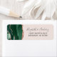 A borda esquerda desta elegante e moderna etiqueta de endereço de retorno de convite de casamento apresenta uma esmeralda verde aquarela agate borda com falso rosa dourado. O texto personalizável combina o script de escrita manual de cinzas de carvão e as fontes de impressão em um fundo cor-de-rosa pincelado.
