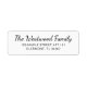 Script de caligrafia mínimo moderno retorna rótulos de endereço em preto e branco. Adicione o nome da sua família ao modelo de script de escrita manual em letras maiúsculas, juntamente com o seu endereço em uma fonte serif fácil de ler. Uma maneira limpa e minimalista de tirar seus convites de festa de formatura, trocar cartões de endereço, etc.