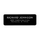 Etiquetas de endereço de retorno elegantes com campos de modelo para o seu nome e endereço. Texto branco sobre fundo preto.