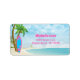 Esta design de etiqueta de endereço de surfe na praia mostra um prato de surfe em uma praia tropical com palmeiras. A água é um belo azul e há nuvens espalhadas no céu. -
