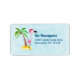 Grandes etiquetas de endereço de natal com um desenho branco de um flamingo cor-de-rosa vestindo um chapéu vermelho de santa. Em pé num monte de areia amarela da praia com uma palmeira de coco verde e marrom no fundo. Fundo azul claro com um padrão polígono fraco. Design tropical festivo, bonito e divertido.