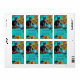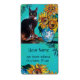Gato preto expressivo e branco, girassóis coloridos e folhas verdes em cores azul-amarelo e azul-turquesa. Pintura acrílica original, artística e vibrante, em painel de madeira, de Búlgaro Lumini (c)