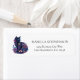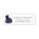 Uma ilustração linda de um gato preto rodeado de flores em tons de rosa, azul e roxo está à esquerda desta etiqueta de endereço de devolução e você pode personalizar facilmente a tipografia preta moderna com seu próprio nome e informações de contato.