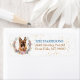 O lado esquerdo destas etiquetas de endereço de retorno apresenta uma imagem de uma coroa de primavera em cores de rosa mole, azul, dourado, verde e creme. No centro está um belo retrato de um Cão German shepherd. Pequeno confete de ouro dá um brilho sutil ao fundo. Seu texto personalizado está em ouro azul e marrom à direita.