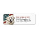 O lado esquerdo destas etiquetas de endereço de retorno apresenta um retrato aquoso de um lindo cão Pirenéus Excelente colocado sobre um fundo verde do sinalizador dos EUA. Seu texto personalizado está em vermelho e preto correspondente à direita.