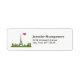 Etiquetas de endereço com um desenho certeiro da Torre Eiffel no fundo rodeado por árvores verdes. Um coração cor-de-água rosa flutuando no ar adiciona um talento feminino.