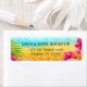 Um rótulo de endereço de retorno do tema praia tropical. Apresentando um design moderno com ramos de palmeiras, flores de Hibiscus cor-de-rosa e conchas numa praia tropical.