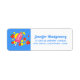 Devolver etiquetas de endereço com um tema de verão. Projetado com picolé cor-de-rosa e alguns morangos vermelhos caindo ao redor do picolé juntamente com alguns plasmas de tinta amarela. Fundo azul.