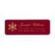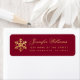 Um rótulo de endereço de retorno burgundy e dourado elegante, recomendado para cartão de Natal das férias de inverno. Tem um floco de neve de folha de ouro falso à esquerda e texto dourado à direita. O nome é escrito em uma caligrafia elegante, o endereço em letras maiúsculas menores. Pode ser usado para um cartão de Natal ou Ano Novo. O fundo é burgundy (vermelho profundo).