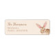 Ilustração em aquarela caprichosa de Destei de um coelho marrom com orelhas extra grandes. Há também duas áreas de texto personalizáveis ideais para um nome e endereço. A cor do fundo é bege.