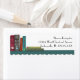 Etiquetas de correspondência com ilustração de uma prateleira de livros verde de borda recortada com seis títulos fictícios de livros: um romance do pioneiro com um vagão coberto, livro de química com garrafa, viagem, livro de culinária, guia de campo de plantas e livro-texto de madeira com avião de madeira antigo. A imagem é transparente e uma cor de fundo pode ser adicionada se desejar.