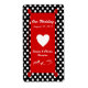 Na moda mini etiquetas de garrafa de vinho feitas em preto com padrão de bolinhas branca. Uma área de texto em forma vermelha, no meio, tem um coração branco e um branco floresce a decorá-la. Todo o texto branco está pronto para personalizar para o seu dia de casamento. Excelente de vinho individual ou garrafas de champanhe como favores aos seus convidados de casamento. Perfeito como parte de cada lugar para a torrada de champanhe.