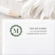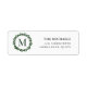 Etiqueta de endereço de volta de Natal festivo com uma coroa verde moldando seu conjunto inicial em um fundo branco clássico.