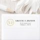 Esta simples etiqueta de endereço de retorno apresenta um monograma dourado para duas iniciais. O monograma é acentuado com um gráfico geométrico dourado.
