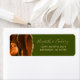 A borda esquerda desta elegante e moderna etiqueta de endereço de retorno de convite de casamento apresenta uma borda de cor de água laranja queimada, aparada com falsa brilho dourado. O texto personalizável combina fontes de manuscrito e de suporte em um fundo verde-oliva.