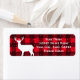 Etiqueta de endereço de retorno de Natal para veados de xadrez de búfalo vermelha. Etiquetas de autocolante para a temporada de Férias. Design com silhueta de uma rena na neve. Cor personalizada do texto e do plano de fundo atrás do padrão de lumberjack marcado. Belo design de inverno para casa ou escritório.
