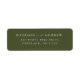 Etiquetas de endereço de retorno de casamento elegantes, com os nomes dos casais separados pela palavra "e", em um roteiro de caligrafia branca, em um fundo verde-oliva. Personalize as etiquetas de endereço de volta do casamento modernas com seu endereço abaixo. As etiquetas de endereço verde-oliva são perfeitas para uso em casamentos, chás de panela e outros eventos especiais.