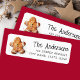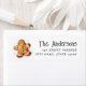Etiqueta de endereço de ida e volta de férias de inverno com uma ilustração aquosa de um homem de pão-de-gengibre e seu nome e endereço em fontes brancas.