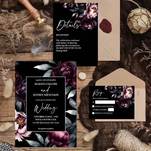 Nó elegante elegante e escura, tudo em um casamento, etiquetas personalizadas de tableware editáveis de modelo, peões negros de burgundy nas etiquetas de endereços de casamento de fundo escuro