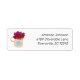 Essas etiquetas de endereço de retorno contêm um pote de flor com flores cor-de-rosa e design azul na frente, com nome e endereço de retorno totalmente personalizados.