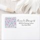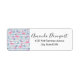 Etiquetas de endereço com um padrão com uma vibração de verão divertida. flamingos e abacaxis cor-de-rosa, colocados sobre um padrão listrado azul claro com folhas e corações ao redor.