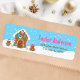 Este rótulo de endereço fofo e festivo apresenta uma casa de pão de gengibre fofo decorada com doce rosa e verde. Além disso, são adoráveis gengibres com presentes, vestidos com chapéus de Papai Noel e cachecol. Ao fundo está um céu azul brilhante de inverno com flocos de neve em queda elegante. Isto é perfeito para o Natal e o feriado de inverno.