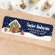 Este rótulo de endereço fofo e festivo apresenta uma casa de pão de gengibre fofo decorada com doce rosa e verde. Além disso, são adoráveis gengibres com presentes, vestidos com chapéus de Papai Noel e cachecol. Ao fundo está um céu azul marinho de inverno com flocos de neve em queda elegante. Isto é perfeito para o Natal e o feriado de inverno.