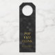 Elegante marcador de pendurar garrafa com as palavras "Pop Fizz Clink" em folha de ouro falso sobre um fundo cinza escuro com luzes bokeh. Perfeito para festas de noivado, casamentos, aniversários ou outros eventos.