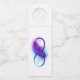 Símbolo infinito com uma bela pena pintada em cores roxas e azuis brilhantes sobre fundo branco.
