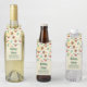 Etiquetas de garrafas com um padrão de Natal giro, com cones de pínus e holly num fundo de aquarela amarela, com pequenos círculos brancos espalhados.