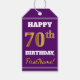 Este design de etiqueta de presente de aniversário apresenta uma mensagem como "HAPPY 70 BIRTHDAY, FirstName!", onde o nome pode ser personalizado, e onde o número "70" tem uma aparência de cor falsa/imitada. A frente também apresenta um fundo de cor púrpura. A parte traseira apresenta uma linha "De:". As etiquetas de presentes de aniversário como estas poderiam talvez ser usadas em presentes que são dados para o 70º aniversário de alguém. [~Z0000212]