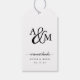 Coloque estas simples e elegantes etiquetas de presentes nos seus favores de casamento para uma forma perfeita de obrigado dos seus convidados. Projetados para coordenar com nossa coleção de convites de casamento Ampersand Monograma, essas etiquetas chic apresentam suas iniciais trabalhadas em um design de monograma, unidas por um ampersor de script decorativo. Personalize com três linhas de texto personalizado abaixo; mostradas com "obrigados mais quentes" e seu nome e data de casamento.