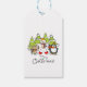 Um bonito, colorido design de Natal com etiquetas de presente que incluem um urso polar, pinguim e rato, todos com lenços e skates de gelo com árvores cobertas de neve e texto que diz É Natal!