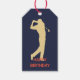 Um golfista de silhueta dourada dá uma tacada na frente desta etiqueta de presente de aniversário. A imagem é colocada sobre um fundo azul escuro. A parte de trás da etiqueta é branca para facilitar a sua marcação, com uma imagem de golfe diferente em azul escuro. Certifique-se de ver o papel de embrulho de presente e os sacos de presentes na nossa loja. *Obrigados para ChiliPapers para as imagens da silhueta usadas neste design.