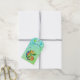 Estas etiquetas de presentes têm um lagarto fantástico em cores brilhantes segurando um galho com uma folha, com balões festivos verdes e azuis sobre um fundo misto azul verde. Personalize seu texto na frente e atrás com os modelos.