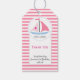 Aniversário do Preppy NMaritime Pink Sail Away Obrigado Round Sticker mostra um veleiro azul-rosa e bebê em um quadro branco. O fundo é um padrão listrado branco e rosa claro. O obrigado de primeiro aniversario desta rapariga, design de etiqueta de presente, é adequado para a festa de aniversário temática náutica de uma rapariga.