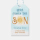 A etiqueta de presente de chá de fraldas deste menino bonitinho apresenta o texto "Aqui Vem O Filho" em tipografia na moda marrom e azul com um sorridente sol de aquarela amarela e céu azul. Facilmente personalizável. Original Watercolor © Michele Davies.