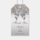 Personalizado elegante e personalizado prata Obrigado etiquetas de presente com um lindo padrão de sequências prateadas impressas, um arco e fita prateados brilhantes e uma joia bonito de mistura de diamante impressa. O texto, a fonte e a cor da fonte podem ser personalizados. Se precisar de ajuda para personalizar seu produto, entre em contato comigo através da minha loja. Ficarei feliz em ajudar. Tenho produtos correspondentes na minha loja.