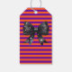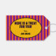 Etiqueta de presente de Halloween, listrada e bruxa com arco gótico.