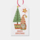 Um pequeno gnomo branco veste um chapéu de Papai Noel listrado e fica ao lado de uma árvore de Natal na frente dessa etiqueta de presente. Uma estrela dourada está acima do gnomo, e seu texto personalizado está embaixo. Na parte de trás da etiqueta, o gnomo está segurando um coração, e seu texto personalizado está na parte de baixo. Esta etiqueta de presente combina com vários temas de Natal em nossa loja.