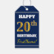 Este design de etiqueta de presente de aniversário apresenta uma mensagem como "HAPPY 20 BIRTHDAY, FirstName!", onde o nome pode ser personalizado, e onde o número "20" tem uma aparência de cor falsa/imitada. A frente também apresenta um fundo de cor azul. A parte traseira apresenta uma linha "De:". As etiquetas de presentes de aniversário como estas poderiam talvez ser usadas em presentes que são dados para o vigésimo aniversário de alguém. [~Z0000215]