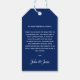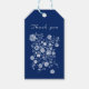 Agradeça aos convidados de uma forma atemporal com estas etiquetas de lembrancinhas florais em azul-marinho, apresentando um delicado buquê de flores silvestres azuis e brancas e uma elegante escrita "obrigado" na frente. O verso inclui uma área para uma nota sincera e uma linha para assinatura, facilitando a adição dos seus nomes ou uma curta mensagem para amigos e familiares. Pré-furadas e prontas para serem amarradas em sacos de lembrancinhas, caixas ou gargalos de garrafas com fita ou cordel, estas etiquetas adicionam um toque final polido a temas de casamento azul-escuro, românticos ou "something blue".