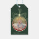 Esta elegante etiqueta de presente de Natal apresenta um clássico design bauble e arco festivo em dourado colocado contra um fundo verde profundo com sotaques vermelhos junto com um dentro de molde redondo com fotografia a um bauble. Ideal para o Natal, fotos de família e presentes de Natal.