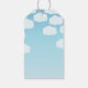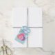 As etiquetas de presente de festa de aniversário apresentam balões redondos coloridos em um arranjo de buquê e texto personalizado que pode ser personalizado com seu nome e ano de aniversário. Projetadas para o aniversário de uma menina, as cores incluem tons vibrantes de rosa, roxo, coral, verde e azul. O fundo do céu azul com nuvens brancas.