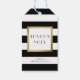 O na moda "Joyeux Noël" personalizou as etiquetas de presentes de Natal com imagens de fundo listradas a preto e branco e de efeito de folha de ouro.