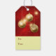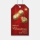 As bolbos de árvore de padrão de ouro brilhante são o recurso na frente dessas elegantes etiquetas de presentes de Natal. As imagens espumantes são colocadas sobre um fundo vermelho abstrato profundo com pedaços de confete dourado. A parte inferior contém texto personalizado em ouro que diz atualmente "FELIZ ANO NOVO DE NATAL DE MERRY". A parte traseira da etiqueta tem a mesma imagem com borda inferior dourada pálida e outro campo de texto. Elegante!